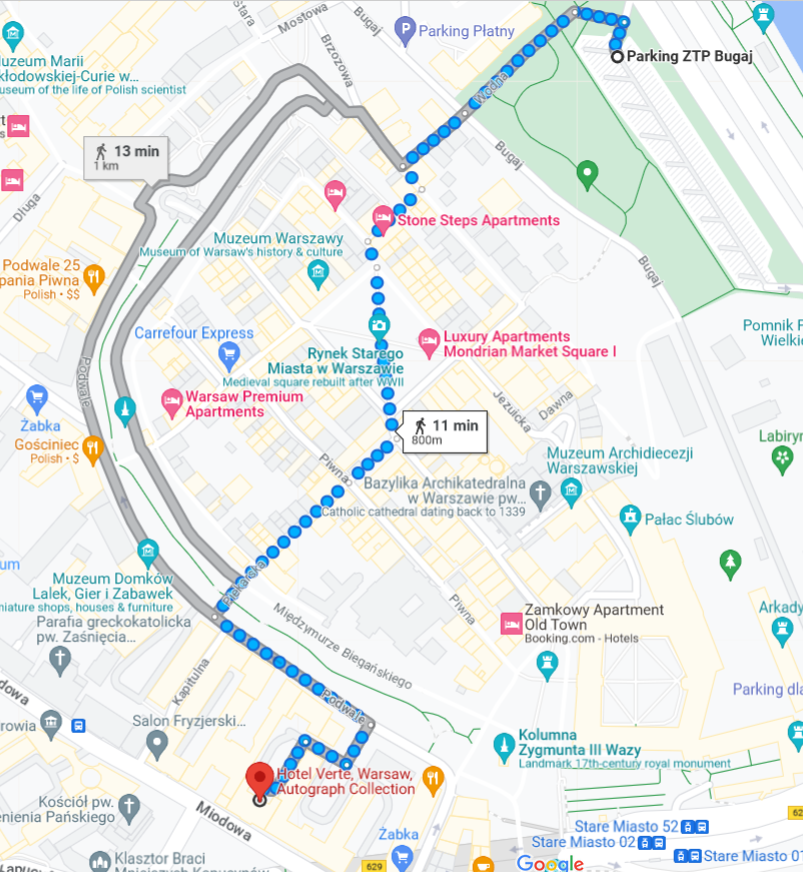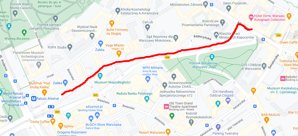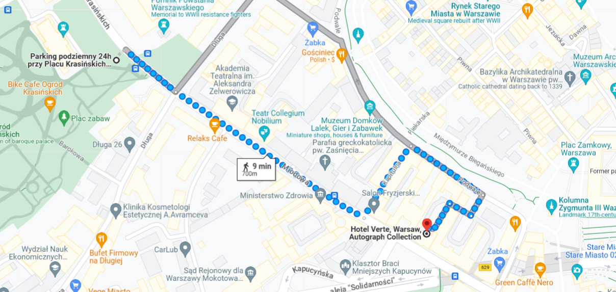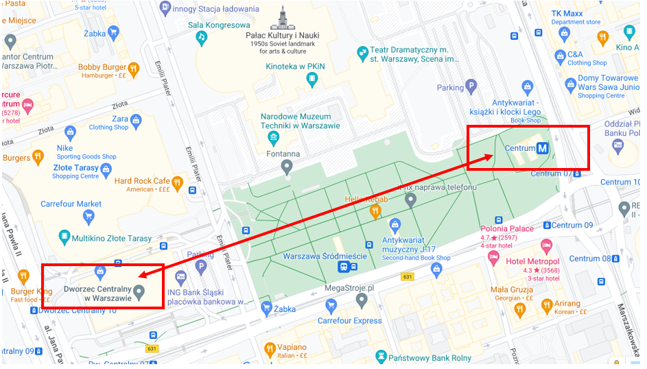 Z Dworca Centralnego – proponujemy przespacerować się (7 min) do najbliższej stacji metra „Centrum”, przejechać dwa przystanki do stacji „Ratusz Arsenał” oraz udać się na kolejny 10 min spacer już do miejsca docelowego.
